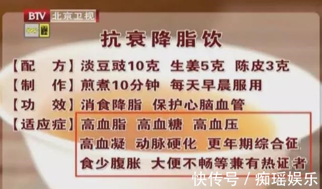 对于高血糖、高血脂、高血压、高血凝、动脉硬化、更年期综合征以及食少腹胀、大便不畅等兼有热证的患者来说,可用淡豆豉、生姜、陈皮三者搭配,制成抗衰降脂饮,每天早晨坚持服用,可以辅助降三高、软化血管,起到较好的消食降脂、保护心脑血管的作用。